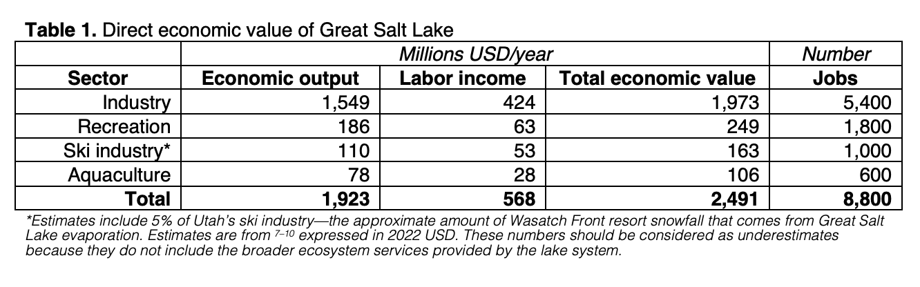 Table 1. Direct economic value of Great Salt Lake Full size 1332 × 416 pixels The Great Salt Lake: An Update on Current Levels, Ongoing Challenges, and Our Next Steps Emergency measures needed to rescue Great Salt Lake from ongoing collapse Previous image Next image